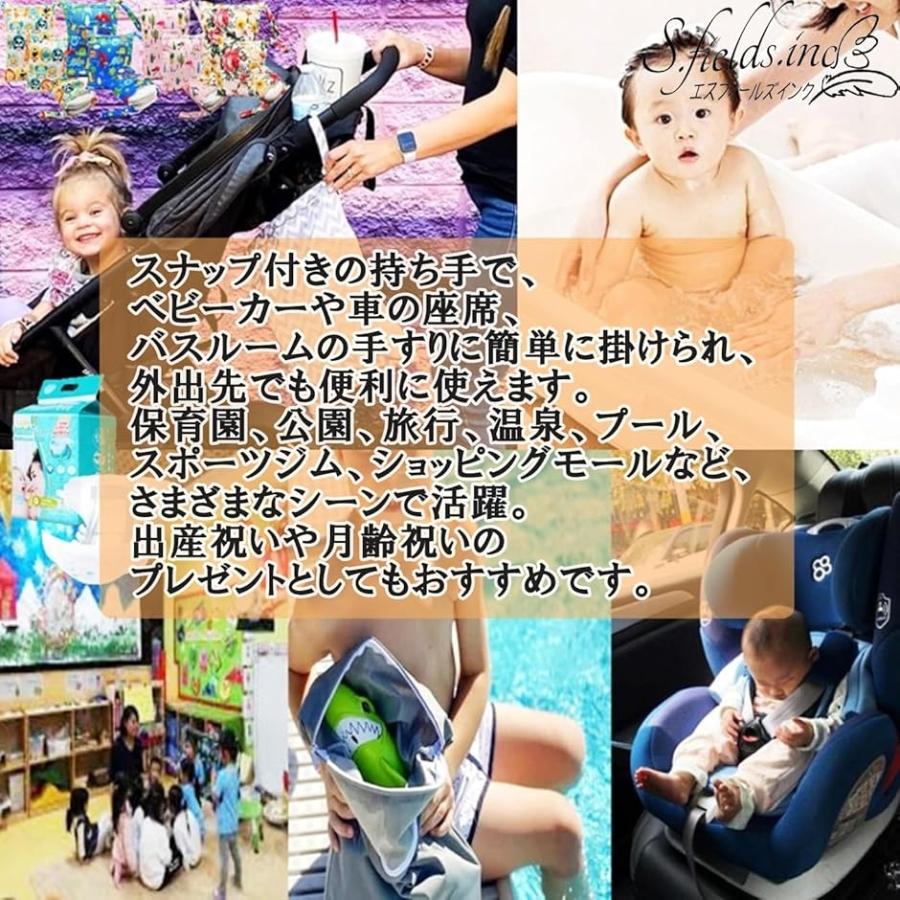スナップ付きの持ち手で、ベビーカーや車の座席、バスルームの手すりに簡単に掛けられ、外出先でも便利に使えます。