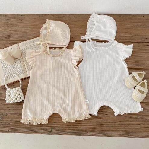 ・肌触りの良いワッフル生地のボンネット付きベビーロンパース